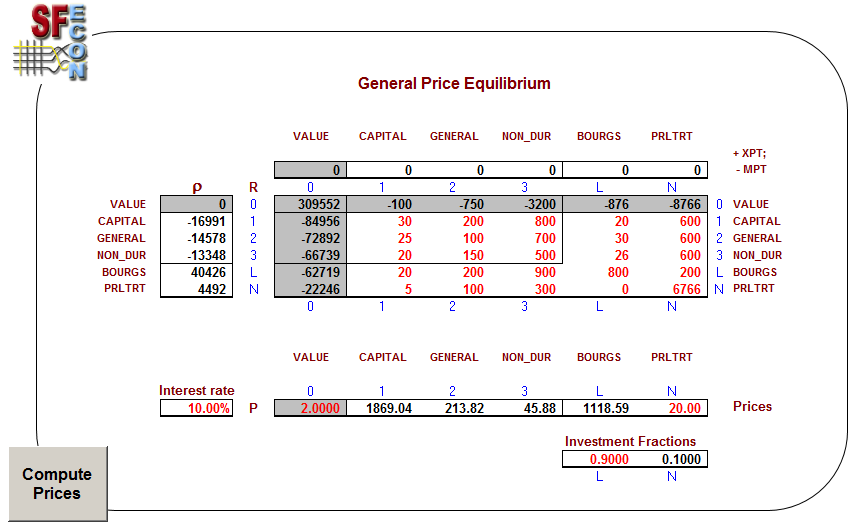 It must be emphasized that our discussion of general equilibrium prices GEP takes place here, among the criteria for economic stasis, rather than among the operational devices we posit as controlling economic order. SFEcon's operational hypotheses, being dynamic, tolerate no references in equilibrium. The calculations set forth below are only used to initiate models in a state of general optimality; and they only serve a theoretical discussion by partly describing the state to which a model subsides when its parameters are held constant. SFEcon's notions about general price equilibria should be familiar except for 1) their reliance on our matrix structure and 2) their novel consideration of the interest rate -iK.