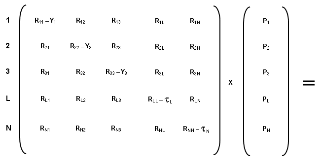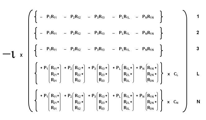 Following conventional practice, these data are used to construct a matrix equation that brings our unknown vector of commodity prices PJ into a formulation of the sectors’ profits. Figure 2 expresses profits in matrix form: each sector I’s sales PIYI are subtracted from its cost of sales SPJRIJ to compute earnings in the negative sense required by SFEcon’s sign convention. A continuation of normal practice would presume that normal profits are somehow expressed in the cost of sales, and then equate the expression in Figure 2 to a null vector representing zero extraordinary profits. Solving this system would require specification of one price to determine the general price level, which would then enable solution of the entire system via Gaussian elimination.